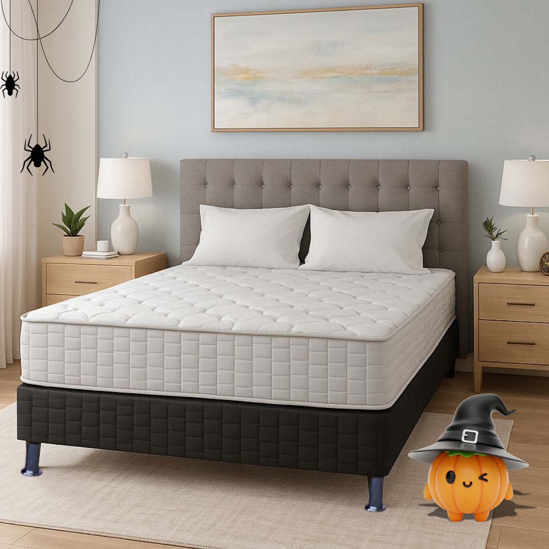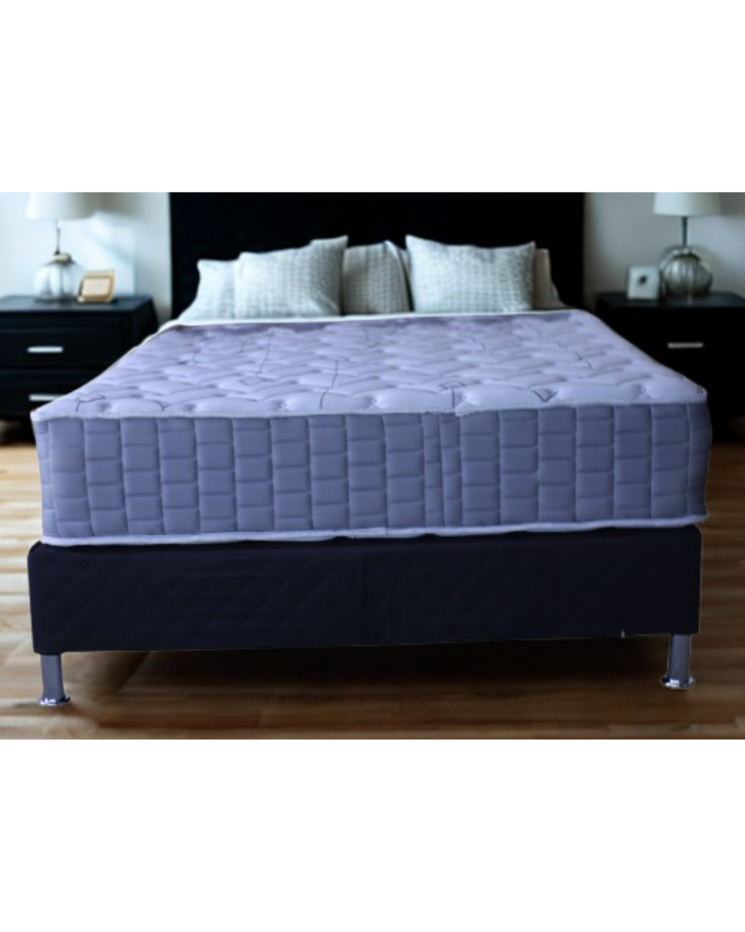 Colchón de resortes premium con soporte de 120 kg por lado, tela jacquard de algodón suave y doble Eurotop. Sommier con box resistente y 7 patas metálicas. Garantía de 4 años.