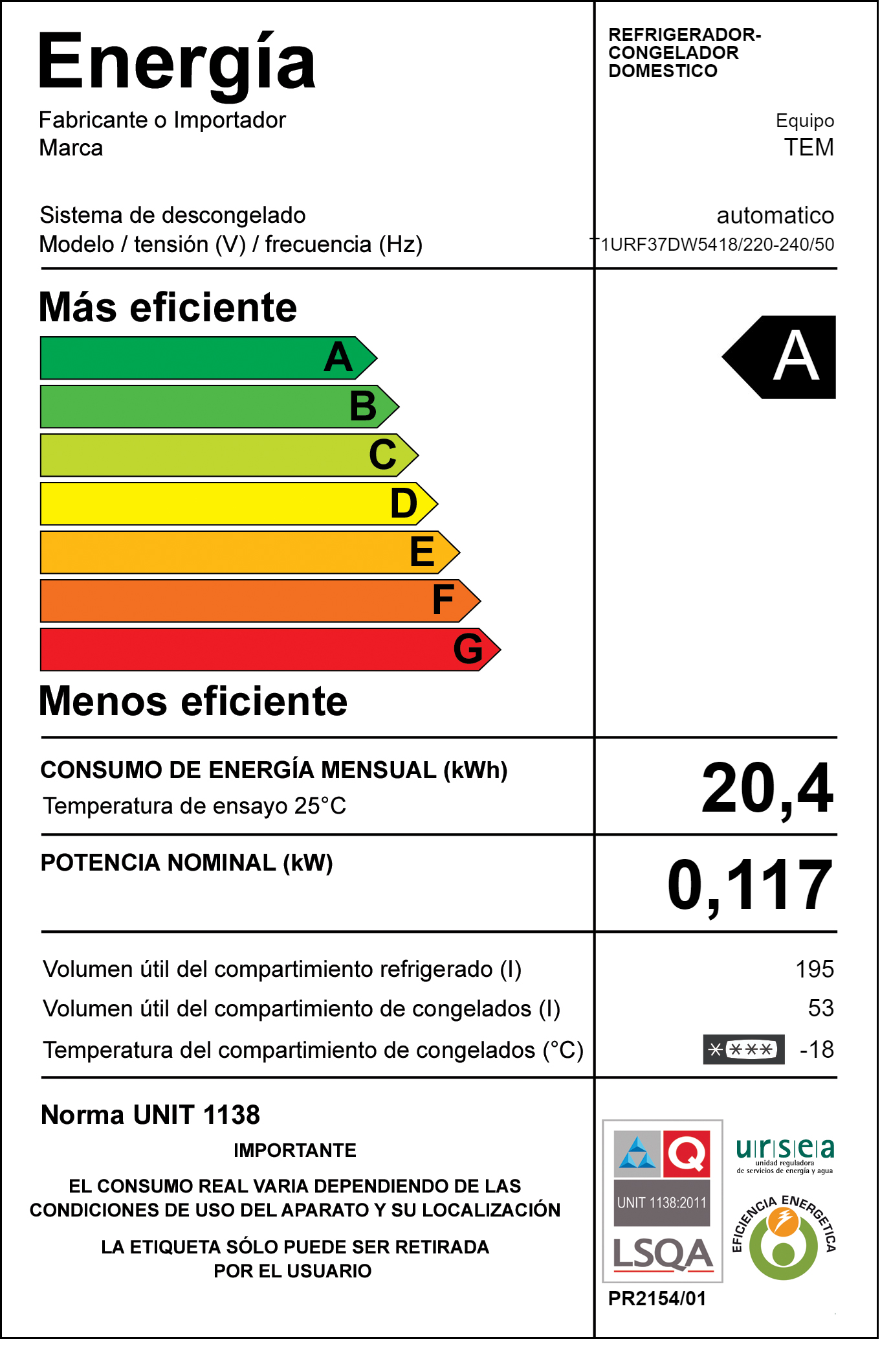 CAPACIDAD: Refrigerador 195 Litros