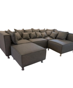 Sillón Cubolongue con tela que repele líquidos, compuesto por 3 módulos de 75×75 cm y 2 esquinas de 90×90 cm. Estructura en eucalipto colorado con polifón de alta densidad y telas importadas de calidad.