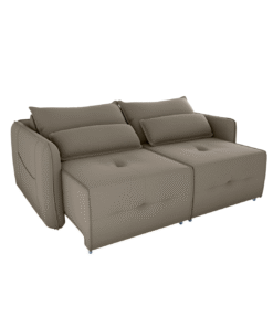 El sofá Celine combina espuma D 23 en asiento y respaldo con estructura de eucalipto reforestado. Cuenta con sistema de correas elásticas y muelles espirales para mayor comodidad. Sus pies tienen ruedas y patines de PVC, y su apertura es manual en el frente. Está asegurado con abrazaderas y tornillos, y viene embalado en malla, plástico y cartón para protección.
